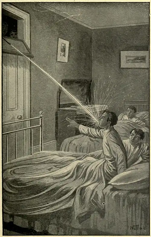 with all his might. It parted about half way down the hallway, and into the room he darted with the piece in his hands. Then Sam and Dick closed the door, locked it, and shoved a bed and the table against the barrier. They also turned the button of the transom window so that the glass could not be swung back as before.