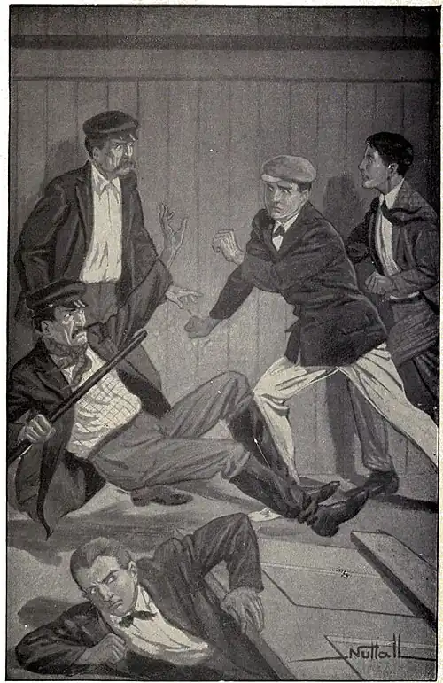 The sight that met Tom's gaze at first almost stupefied him. He came upon Sack Todd and Dan Baxter fighting hand to hand in a passageway leading to the deck. Sack Todd had fired one shot which had grazed Dan's left cheek. But now the youth had the man against the wall and was banging his head against it again and again.