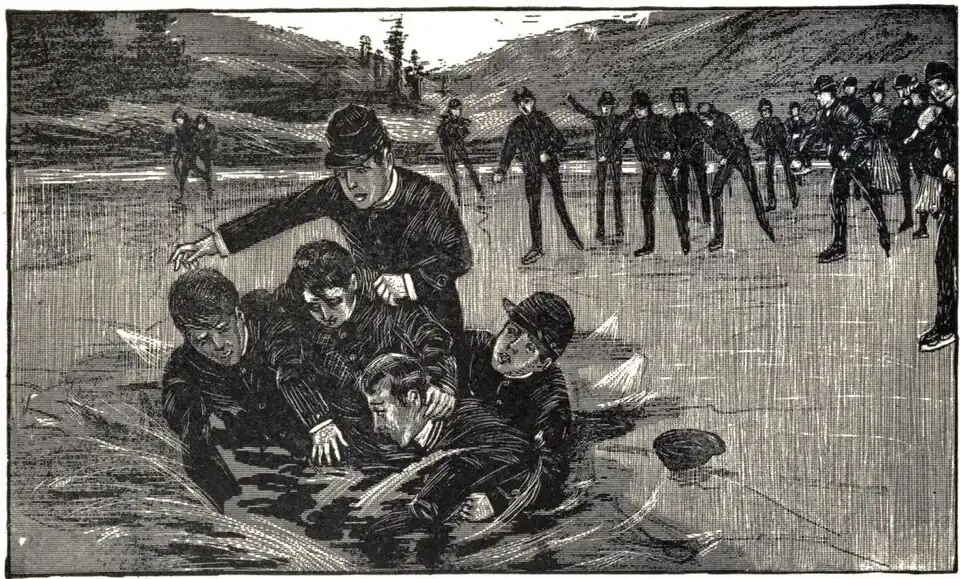 Some of the imperiled boys who had not gone down very deeply managed to scramble out with wet feet or wet lower limbs only, but when the crowd had drawn back it was seen that three boys were floundering in the chilling water over their heads. These boys were George Granbury and Frank Harrington, who had been supporting Tom on their shoulders, and Tom himself, who had been dropped into the opening head first by the frightened lads.