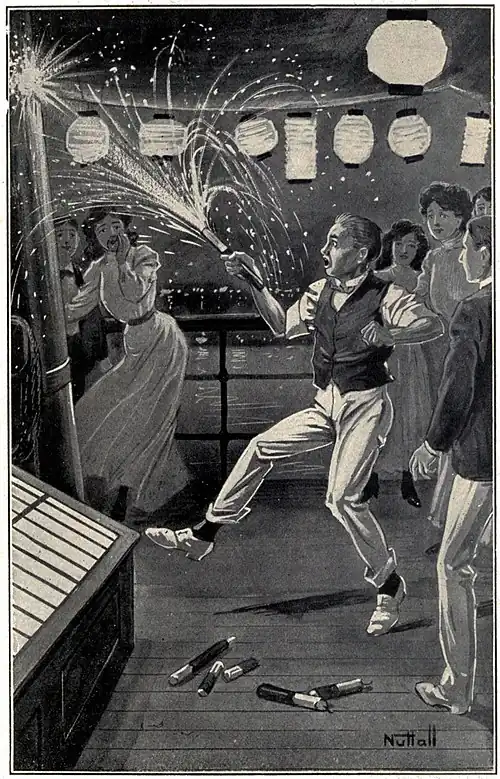 Around and around went the Roman candle and then bang! out shot a ball, hitting one of the masts of the steam yacht. Then bang! went another ball, hitting the top of the cabin.
