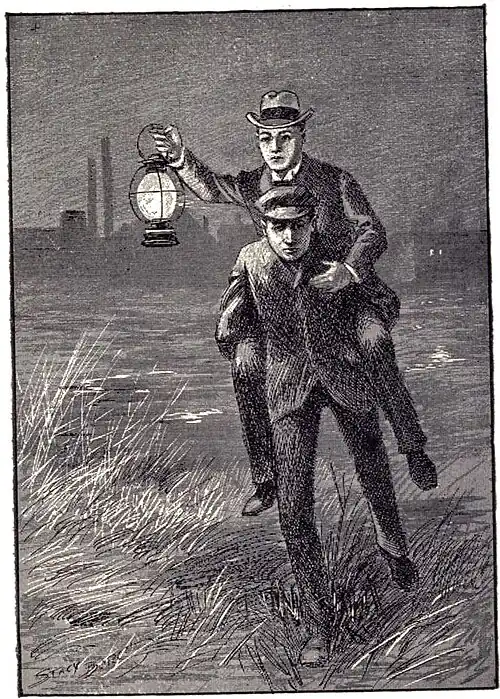 In the meantime Sam heard the rapid footsteps and the cry of alarm, and his heart leaped into his throat. Then, as Dan Baxter and Mumps came toward him, he retreated in the direction of the Searchlight, giving the danger signal as he ran.