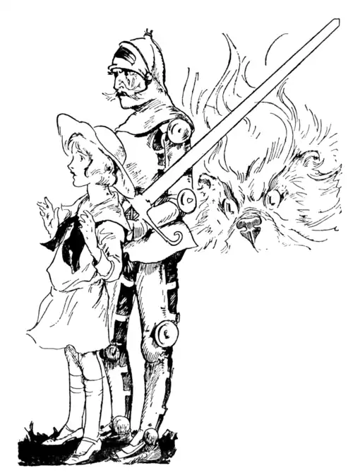 "Oh, I wish dear Sir Hokus were himself again," wailed Dorothy, after trying in vain to recall some magic sentences. Presto! The Knight stood before them, a bit breathless from flying, but hearty as ever.