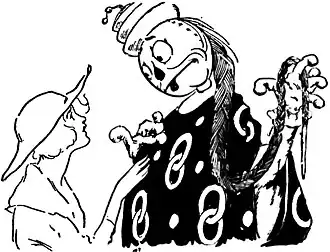 "That's it, that's it exactly!" exclaimed the Scarecrow, as Dorothy finished repeating the verse. "'You are old, Father Scarecrow—!' that's all I hear. I did stand on my head, too. And, Dorothy, I can't seem to get used to being a grandparent," added the Scarecrow in a melancholy voice. "Ti's turning my straws gray." He plucked several from his chest and held them out to her. "Why, those little villians don't even believe in Oz! 'It's not on the map, old Grandpapapapapah!'" he mumbled, imitating the tones of his little grandsons so cleverly that Dorothy laughed in spite of herself.