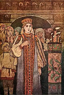 The Tsar's daughter took the distaff and the golden spindle, hastened back to the palace, thrust into the Bright-Hawk's cloak an enchanted brooch, so that he might sleep more soundly and not wake from his sleep for a long, long time, and then she ordered the serving-women to bring the beautiful girl into the palace to see the Bright-Hawk, while she herself went out to walk.