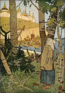 The beautiful girl replied: "Grannie, the Bright-Hawk used to be with me, but my sisters did me an injury. He flew from me beyond the distant seas, beyond the lofty mountains, into the thrice-ninth empire, into the thirtieth kingdom; and now I am in search of him."