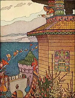 The princess wept many tears. The prince gave her much good advice, forbade her to leave her lofty enclosure, or to go into company, or to gossip with naughty people, or to listen to idle talk. The princess promised to obey him in all things. The prince went away. The princess locked herself in her room and did not leave it.
