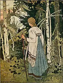 So Vasilisa made haste, hid the Doll in her pocket, and having crossed herself went into the dense forest. As she went along tremblingly a horseman suddenly galloped past her. He was white, his dress was white, the horse he rode was white, and the horse's trappings were white. Outdoors it began to grow light.