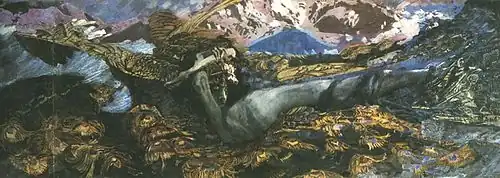 But at the same time Vrubel is a true décadent and herein lies the cause of his failure to achieve success not only among the public at large, but also among artists. We do not mean to say that Vrubel ever played antics to please the fad of the hour, or that he purposely distorted his art. Vrubel is just such a décadent as Beardsley, Somov, Gauguin, as Tiepolo and Watteau in former days, as the art of Rococo, and as that of the "flamboyant" Gothic style and of Romanticism. Vrubel is excessively exquisite, too refined, too far removed from common understanding. At the same time,—and this is a feature of the end of the nineteenth century—his magnificent art is full of inconsistencies, of chasms and oddities. Many see in these deficiencies the first signs of his insanity, but it appears to us that his disease was to a considerable degree caused by the consciousness of these deficiencies, which he could not correct, and which were rooted in the entire state of contemporary art. The struggle of a soul of an artistic genius with the inability to express itself,—thus can the tragedy of Vrubel's life be characterised. The horror in this duel was all the greater in that his impotence seemed to mock at him,—in that it was not an organic quality of his nature, but rather a demoniac principle, which unexpectedly invaded his work.