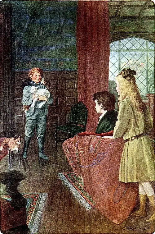 Dickon came in smiling his nicest wide smile. The new-born lamb was in his arms and the little red fox trotted by his side. Nut sat on his left shoulder and Soot on his right and Shell's head and paws peeped out of his coat pocket.