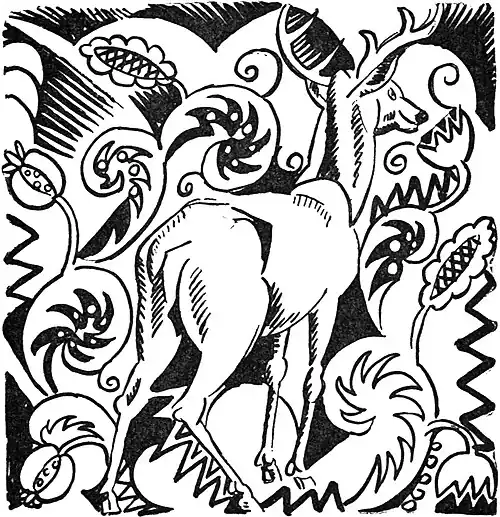 This time by good luck the deer was not far away. When he heard Smolicheck’s cry, he bounded up, drove the little wood maidens off, and carried Smolicheck home on his antlers.