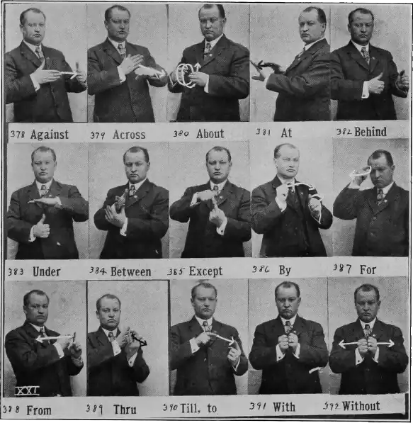By.—Hold the "A" hands in front, side by side, the right a little higher than the left; bend both hands toward the left, twisting them from the wrists, so the thumbs point over toward the left. XXI, 386.