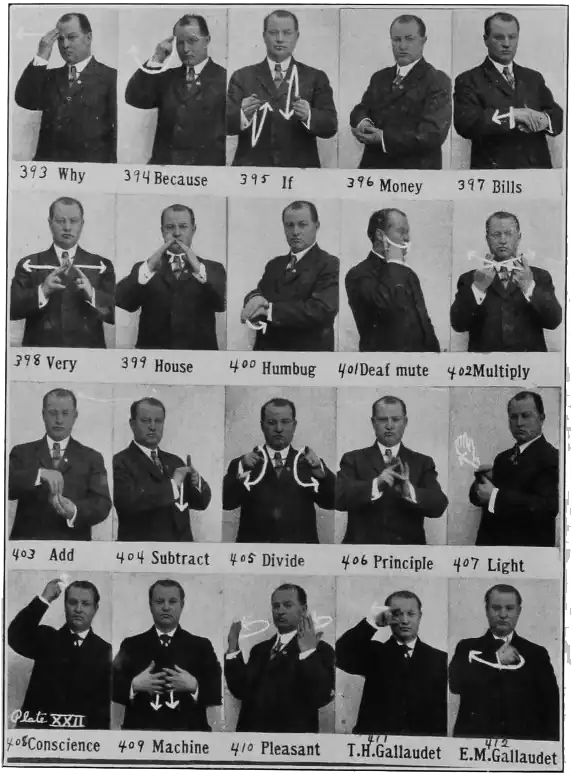 Rev. T. H. Gallaudet.—Place the "G" hand at the right eye, the forefinger above and the thumb immediately below; draw the hand away toward the right and as the hand leaves the head bring the ends of the forefinger and thumb together. XXII, 411.