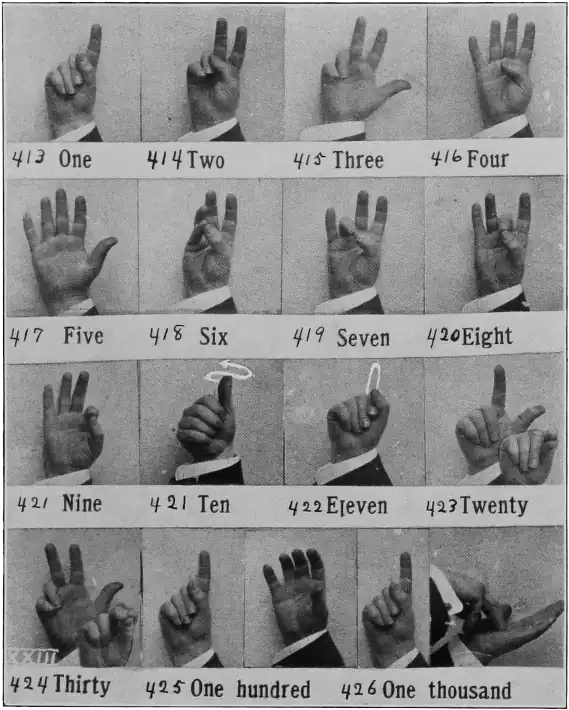 For 1,000, 2,000, etc., make the prime figure, then strike the palm of the open left hand with the end of the right "M" or simply with the bent right hand. Above these add the figures as made before. XXIII, 426.