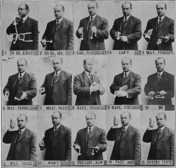 The tense signs are as follows: For the present, same as "now," i. e., Hold the open or bent hands, in front, from the sides, palms up, and drop them both at the same time with a slight jerking motion. The past is indicated by throwing the right open hand back over the right shoulder, palm backward. The future is indicated by "will" (see above). In making the sign for any verb the tense sign is rarely given unless essential to make it specific. Usually the tense is understood by inference. I, 13, 14, 15.