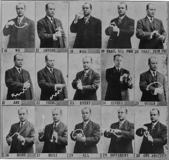 Other.—Position of hand as in "A," thumb well up; with a motion including the whole forearm, describe a semicircle in the air with the end of the thumb. For the plural, repeat two or three times, or add sign for "many." II, 25.