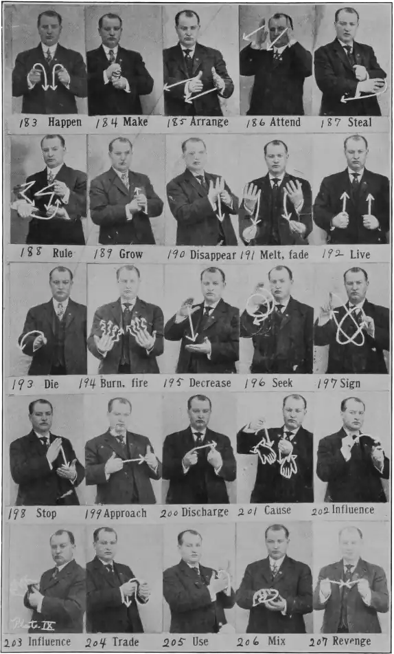 Act, Conduct, Deed.—Place bent hands in front from the side, fingers bent and pointing down; move them apart and then toward each other quite actively and give them a shaking motion. Some move hands in same direction all the time from side to side. This is more particularly mere conduct, while the former indicates activity.