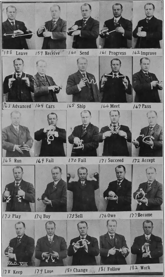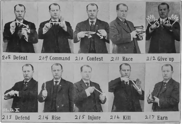 Order (to give a command).—Hold the end of the forefinger of the right "G" hand at the mouth, under the lower lip, give it a slight twist outward as in "speak," then elevate toward the right side, carrying the hand as far out as the shoulder, and as high as the head, then turn the hand so the palm is out and throw the hand forward and down. The hand stops before it goes clear down and the forefinger bends forward.