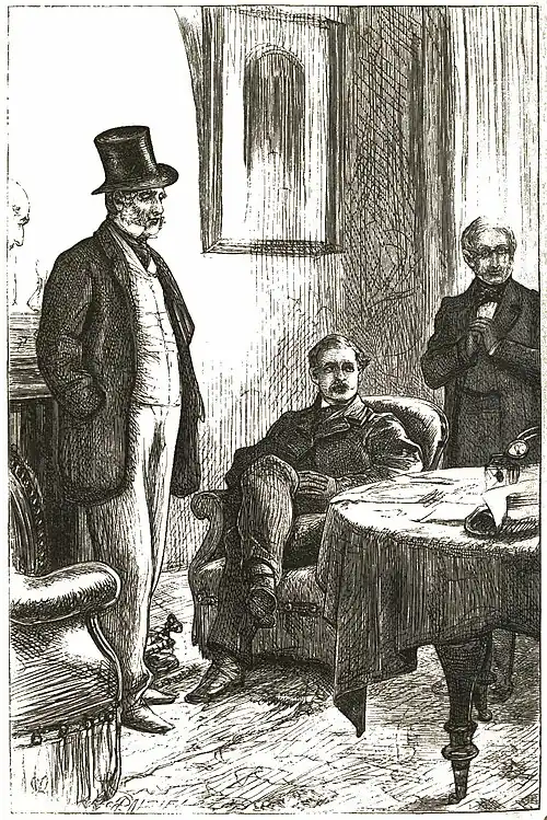 But Crosbie was not a man to commit suicide. In giving him his due I must protest that he was too good for that. He knew too well that a pistol-bullet could not be the be-all and the end-all here, and there was too much manliness in him for so cowardly an escape. The burden must be borne. But how was he to bear it? There he sat till it was two o'clock, neglecting Mr. Butterwell and his office papers, and not stirring from his seat till a messenger summoned him before the Board. The Board, as he entered the room, was not such a Board as the public may, perhaps, imagine such Boards to be. There was a round table, with a few pens lying about, and a comfortable leathern arm-chair at the side of it, farthest from the door. Sir Raffle Buffle was leaving his late colleagues, and was standing with his back to the fire-place, talking very loudly. Sir Raffle was a great bully, and the Board was uncommonly glad to be rid of him; but as this was to be his last appearance at the Committee Office, they submitted to his voice meekly. Mr. Butterwell was standing close to him, essaying to laugh mildly at Sir Raffle's jokes. A little man, hardly more than five feet high, with small but honest-looking eyes, and close-cut hair, was standing behind the arm-chair, rubbing his hands together, and longing for the departure of Sir Raffle, in order that he might sit down. This was Mr. Optimist, the new chairman, in praise of whose appointment the Daily Jupiter had been so loud, declaring that the present Minister was showing himself superior to all Ministers who had ever gone before him, in giving promotion solely on the score of merit. The Daily Jupiter, a fortnight since, had published a very eloquent article, strongly advocating the claims of Mr. Optimist, and was naturally pleased to find that its advice had been taken. Has not an obedient Minister a right to the praise of those powers which he obeys?