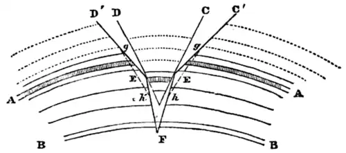 The most obvious explanation of the cause of such a condition of things seems to be the following. Let a set of beds of rock of indefinite extent, among which are two marked ones. A and B, be acted on by an elevating force from below, causing them to bulge upwards as in Fig. 29. Mr. Hopkins has shown us that if this expansion be continued far enough, the result will be the production of one or more longitudinal fissures, commencing at some point below the surface. Let such a fissure be produced running from F to E, and at E let it split into two, E D and E C.
