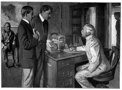 Before eight o'clock next morning they were waiting in a large, plainly furnished room of a barn-like office building perched on the hillside of Culebra. The walls were covered with maps and blue prints. At a desk heaped with papers sat the soldierly, white-haired ruler of forty thousand men, the supreme director of a four-hundred-million-dollar undertaking. His cheek was ruddy, his smile boyish, and he appeared to be at peace with all the world.