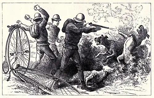 Now if there was anything in the world that Joe was afraid of it was an ugly dog; and that these brutes were ugly as well as bold (if they hadn't been bold they would not have killed that sheep in broad daylight) was quickly made apparent. The minute Joe came within sight of them he sounded his bell, whereupon the dogs dropped their prey and raised their heads; but instead of taking themselves off, as my master thought they would, they stood their ground, snarling and showing their white, gleaming fangs as a welcome to the advancing wheelman.