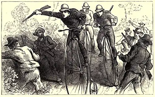 If the Buster band really had a "looking-out place" anywhere within sight of the road I don't know it, but I do know that by taking short cuts through the mountains they managed to reach the highway in advance of us, for when we reached the top of the hill of which I have spoken, and the wheelmen were about to stow the rifles in their cases preparatory to a coast, Matt Coyle and Dave Daily suddenly stepped out of a thicket on one side of the road, and as many more ruffians arose from behind the fence on the other. They were about thirty yards away, and although all except Matt carried guns in their hands, I was relieved to see that there was not a club or stone among them. They supposed that all they had to do was to form across the road, call upon the boys to halt, and they would be obeyed.