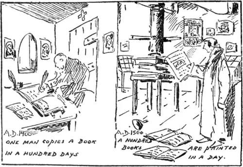 All Italy (and very soon all of Europe) was filled with men and women who lived that they might add their mite to the sum total of our accumulated treasures of knowledge and beauty and wisdom. In Germany, in the city of Mainz, Johann zum Gänsefleisch, commonly known as Johann Gutenberg, had just invented a new method of copying books. He had studied the old woodcuts and had perfected a system by which individual letters of soft lead could be placed in such a way that they formed words and whole pages. It is true, he soon lost all his money in a law-suit which had to do with the original invention of the press. He died in poverty, but the "expression" of his particular inventive genius lived after him.