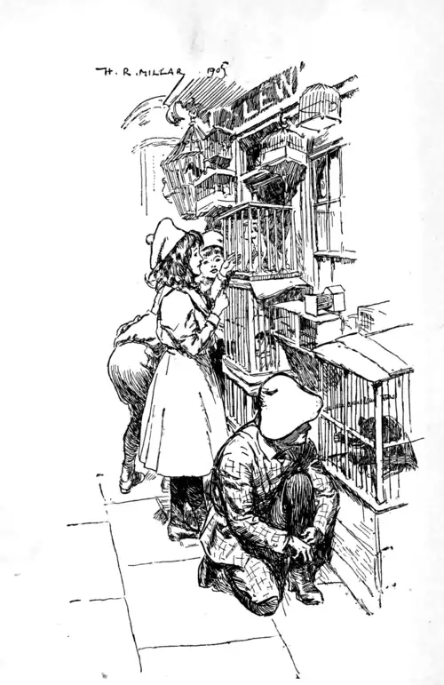 Presently, by some wonderful chance turn of Robert's (who had been voted Captain because the girls thought it would be good for him—and indeed he thought so himself—and of course Cyril couldn't vote against him because it would have looked like a mean jealousy), they came into the little interesting criss-crossy streets that held the most interesting shops of all—the shops where live things were sold. There was one shop window entirely filled with cages, and all sorts of beautiful birds in them. The children were delighted till they remembered how they had once wished for wings themselves, and had had them—and then they felt how desperately unhappy anything with wings must be if it is shut up in a cage and not allowed to fly.