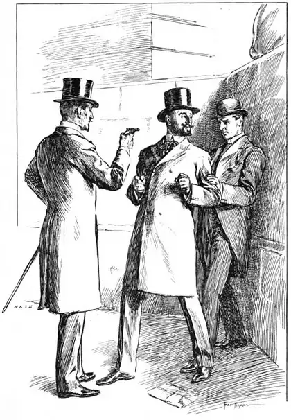 Pringle turned to go, but was confronted by a revolver, and as his eye traversed the barrel and met that of its owner, he recognised the Frenchman to whom he had just sold the bundle of newspapers. Dodging the weapon, he tried to spring into the open, but a restraining grip on each elbow held him in the angle of the plinth, and turning ever so little Pringle found himself in custody of the man whom he had last seen in full cry up the Lowther Arcade. No constable was anywhere near, and even casual passengers walked unheeding by the nook, so quiet was the progress of this little drama. Lowering his revolver, the dark gentleman picked up the parcel which had fallen from Pringle in the struggle. He opened it with delicacy, partially withdrew some sheets of tracing paper, which he intently examined, and then placed the whole in an inner pocket, and giving a sign to the spy to loose his grasp, he spoke for the first time.