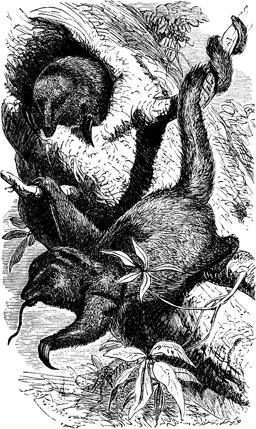 “The Little Ant-eater is not more than about twenty-one inches in length, has a shorter and more natural looking head, and fine silky fur. It usually lives in trees.”