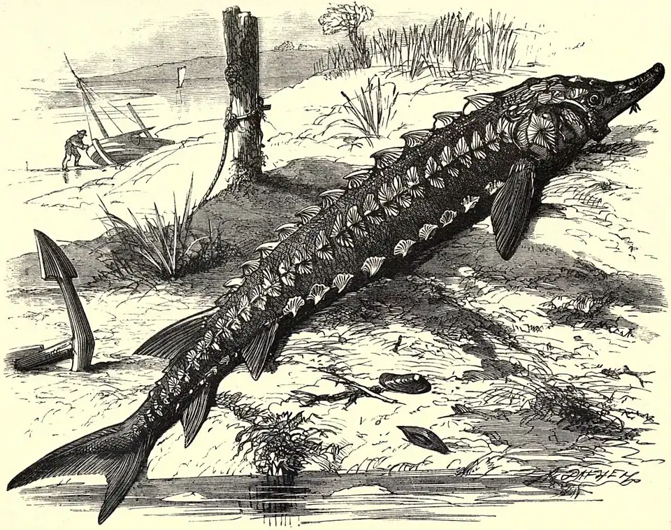 We were soon all in the water, Fritz with a harpoon, Ernest with a rod and line, and I myself, armed like Neptune, with an iron trident, or more properly speaking, perhaps, a pickfork. Soon the shore was strewn with a goodly number of the finest fish—monster after monster we drew to land. At length Fritz, after harpooning a great sturgeon full eight feet long, could not get the beast ashore; we all went to his assistance, but our united efforts were unavailing.