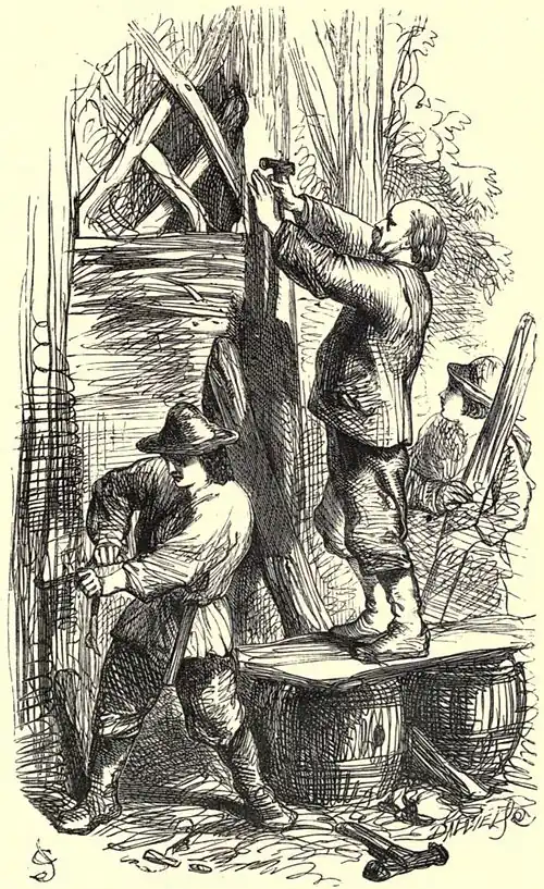 The group of trees we had selected was exactly suited to our purpose, for it formed a regular rectilinear figure, the greatest side of which faced the sea. I cut deep mortices in the trunks about