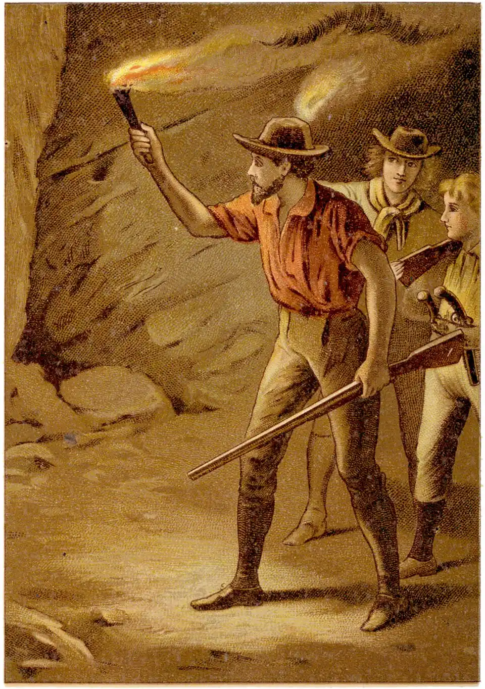With a shout of joy, the boys battered vigorously at the rock; piece by piece fell, and soon the hole was large enough for us to enter. I stepped near the aperture, and was about to make a further examination, when a sudden rush of poisonous air turned me giddy, and shouting to my sons to stand off, I leaned against the rock.