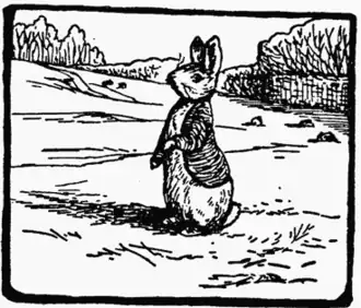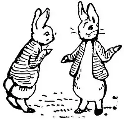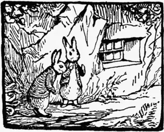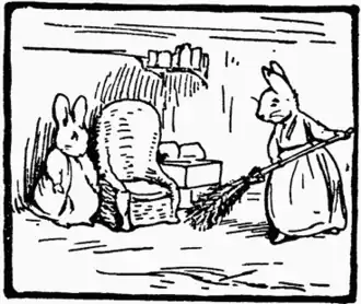 Benjamin Bunny sat up, staring; his whiskers twitched. Inside the stick house somebody dropped a plate, and said something. Benjamin stamped his foot, and bolted.