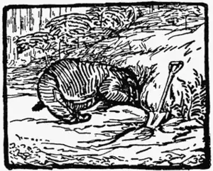 Tommy Brock was a short bristly fat waddling person with a grin; he grinned all over his face. He was not nice in his habits. He ate wasp nests and frogs and worms; and he waddled about by moonlight, digging things up.