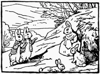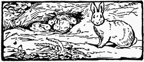 The sunshine was still warm and slanting on the hill pastures. Half way up, Cottontail was sitting in her doorway, with four or five half-grown little rabbits playing about her; one black and the others brown.