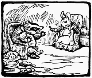 So old Mr. Bouncer laughed; and pressed Tommy Brock to come inside, to taste a slice of seed-cake and "a glass of my daughter Flopsy's cowslip wine." Tommy Brock squeezed himself into the rabbit hole with alacrity.