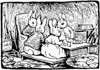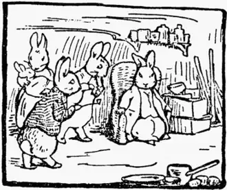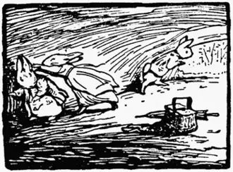 Great was old Mr. Bouncer's relief and Flopsy's joy when Peter and Benjamin arrived in triumph with the young family. The rabbit babies were rather tumbled and very hungry; they were fed and put to bed. They soon recovered.
