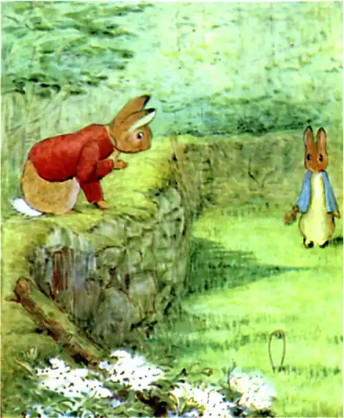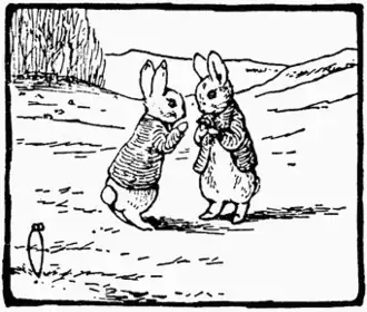 Benjamin climbed over the wall, into a meadow. He found another mole trap newly set; he was still upon the track of Tommy Brock. It was getting late in the afternoon. Other rabbits were coming out to enjoy the evening air. One of them in a blue coat, by himself, was busily hunting for dandelions.—"Cousin Peter! Peter Rabbit, Peter Rabbit!" shouted Benjamin Bunny.