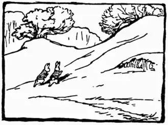 "My Uncle Bouncer has displayed a lamentable want of discretion for his years;" said Peter reflectively, "but there are two hopeful circumstances. Your family is alive and kicking; and Tommy Brock has had refreshments. He will probably go to sleep, and keep them for breakfast." "Which way?" "Cousin Benjamin, compose yourself. I know very well which way. Because Mr. Tod was at home in the stick-house he has gone to Mr. Tod's other house, at the top of Bull Banks. I partly know, because he offered to leave any message at Sister Cottontail's; he said he would be passing." (Cottontail had married a black rabbit, and gone to live on the hill.)