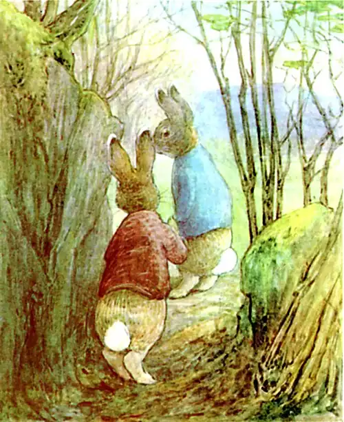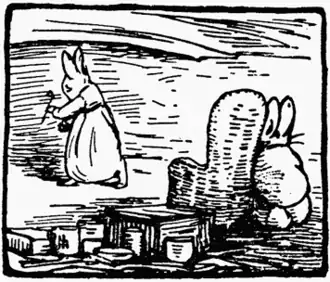 Benjamin Bunny came out of the dark tunnel shaking the sand from his ears; he cleaned his face with his paws. Every minute the sun shone warmer on the top of the hill. In the valley there was a sea of white mist, with golden tops of trees showing through.