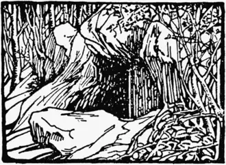 The sun had set; an owl began to hoot in the wood. There were many unpleasant things lying about that had much better have been buried; rabbit bones and skulls, and chickens' legs and other horrors. It was a shocking place, and very dark.
