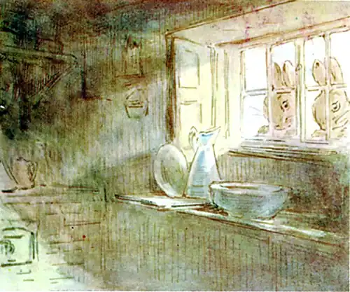 After much whispering, Peter and Benjamin decided to dig a tunnel. They began to burrow a yard or two lower down the bank. They hoped that they might be able to work between the large stones under the house; the kitchen floor was so dirty that it was impossible to say whether it was made of earth or flags.