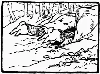 When they came near the wood at the top of Bull Banks, they went cautiously. The trees grew amongst heaped up rocks; and there, beneath a crag, Mr. Tod had made one of his homes. It was at the top of a steep bank; the rocks and bushes overhung it. The rabbits crept up carefully, listening and peeping.