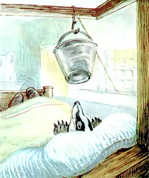 As he could not lift the whole pailful of water at once he fetched a milk jug and ladled quarts of water into the pail by degrees. The pail got fuller and fuller, and swung like a pendulum. Occasionally a drop splashed over; but still Tommy Brock snored regularly and never moved,—except in one eye.