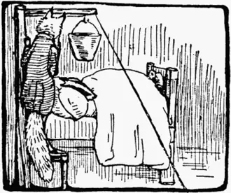 Mr. Tod descended safely from the chair, and endeavoured to get up again with the pail of water. He intended to hang it from the hook, dangling over the head of Tommy Brock, in order to make a sort of shower-bath, worked by a string, through the window