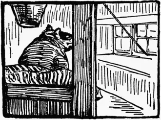The room inside was so dark that at first they could make out nothing; but they could hear a noise—a slow deep regular snoring grunt. And as their eyes became accustomed to the darkness, they perceived that somebody was asleep on Mr. Tod's bed, curled up under the blanket.—"He has gone to bed in his boots," whispered Peter.