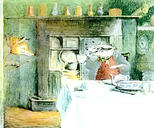The sight that met Mr. Tod's eyes in Mr. Tod's kitchen made Mr. Tod furious. There was Mr. Tod's chair, and Mr. Tod's pie dish, and his knife and fork and mustard and salt cellar, and his table-cloth, that he had left folded up in the dresser—all set out for supper (or breakfast)—without doubt for that odious Tommy Brock.