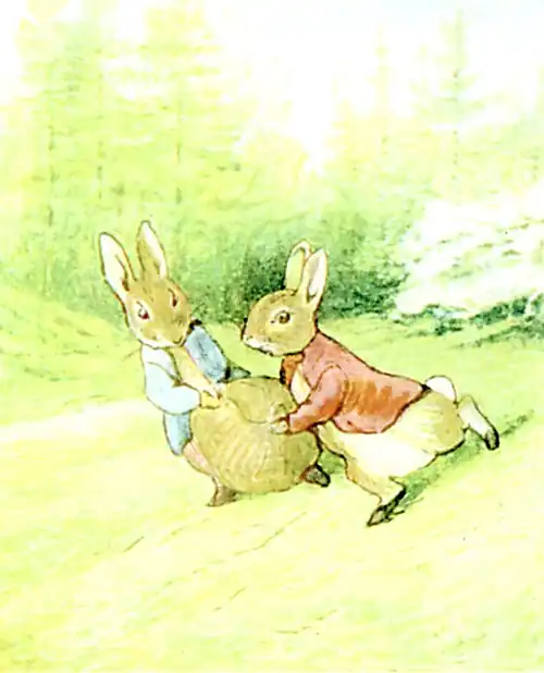 Five minutes afterwards two breathless rabbits came scuttering away down Bull Banks, half carrying, half dragging a sack between them, bumpetty bump over the grass. They reached home safely, and burst into the rabbit hole.