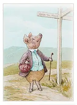 Pigling Bland went on alone dejectedly; he came to cross roads and a sign-post—"To Market-town, 5 miles," "Over the Hills, 4 miles," "To Pettitoes Farm, 3 miles."